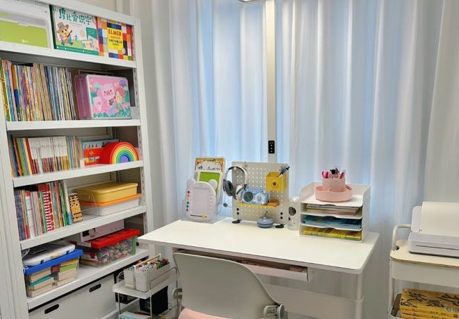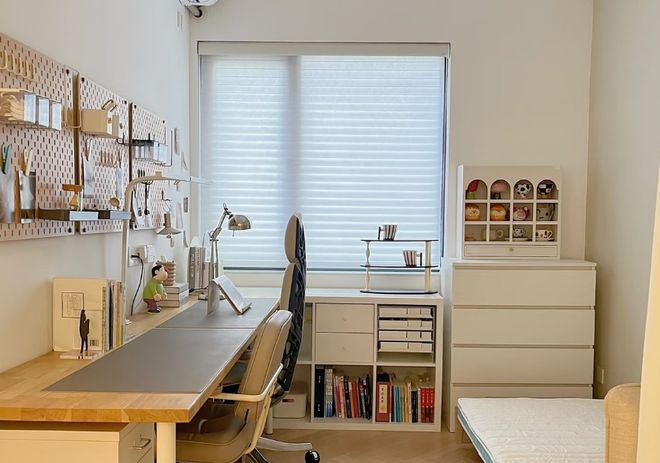 将次卧打造成一个能激发创造力的工作室,墙面可以使洞洞板或磁吸墙,方便挂载各种工具和材料。工作台面尽量宽大,并且坚固易清洗。