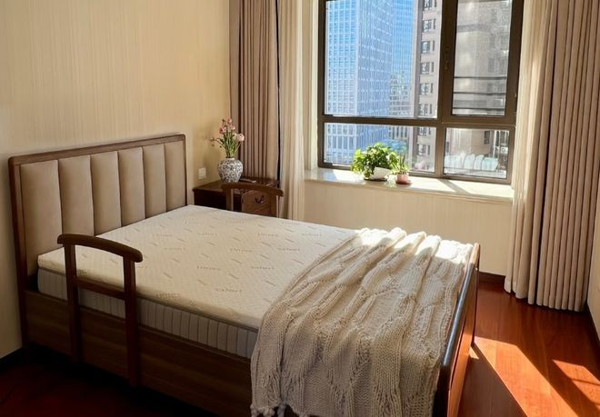 在装修的时候拆除了门槛,实现了全屋无障碍。地面常规采用的是柔光防滑的软木地板,墙面安装L型扶手,床头和卫生间设置紧急呼叫按钮。