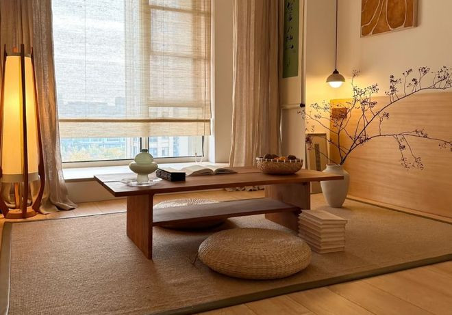 装修可以用木质格栅引入柔和的光线,营造出朦胧美感。墙面可以留白,挂一幅字画或一个器物,角落点缀一盆绿植,一个博物架,非常具有禅意。