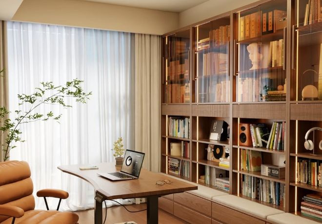 装修建议:书架的深度要注意,建议在30~35厘米,高度不超过2.2米,方便取阅。而大长桌最好预埋地插,方便电脑等用电设备使用。