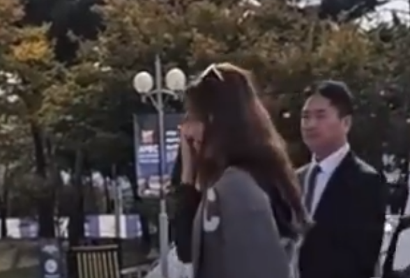 就在机场偶遇前没几天,她还跟刘强东一起在韩国参加APEC会议,现场照片里,刘强东一直搀着她的手臂进场,她就直直地看着前面。