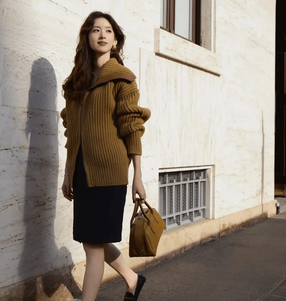 从侧面看,她的脸蛋稍微有点圆润,看着更成熟了,也更显福气。
