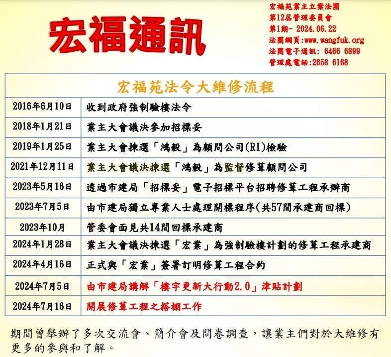 宏福苑法令大维修流程。图/第十二届法团管委会通讯公告第1期