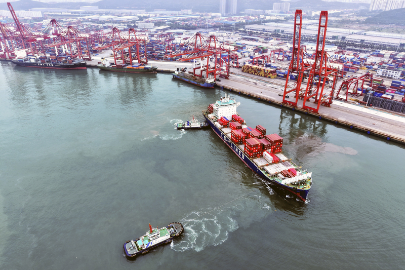 9月8日,在山东港口集团青岛港,一艘装载外贸集装箱的货轮驶离泊位(无人机照片)。9月8日,海关总署发布8月份外贸数据,我国货物贸易进出口总值3.87万亿元,同比增长3.5%,其中出口2.3万亿元、进口1.57万亿元,同比分别增长4.8%和1.7%,连续3个月实现双增长。\n 新华社发(俞方平 摄)